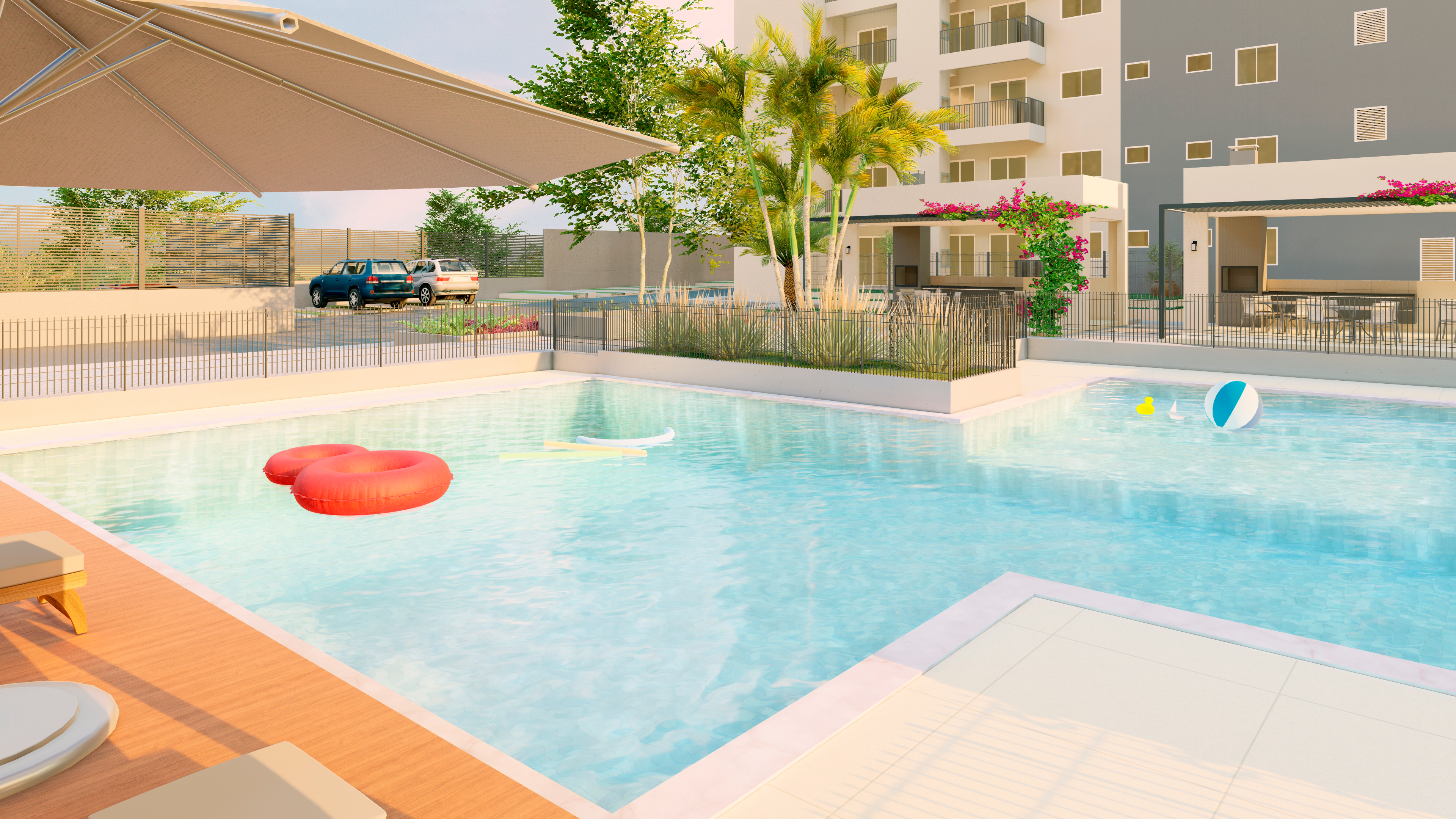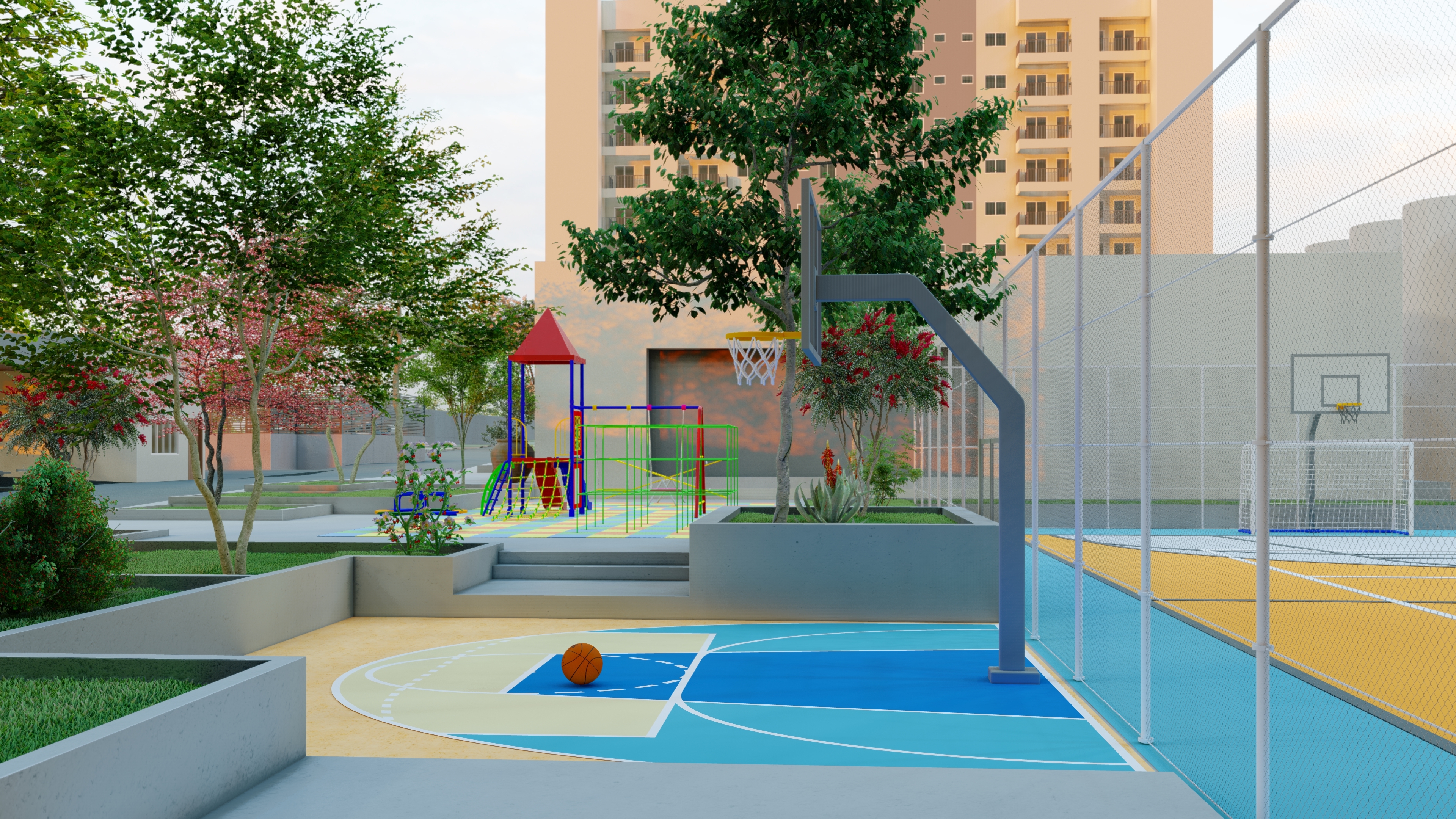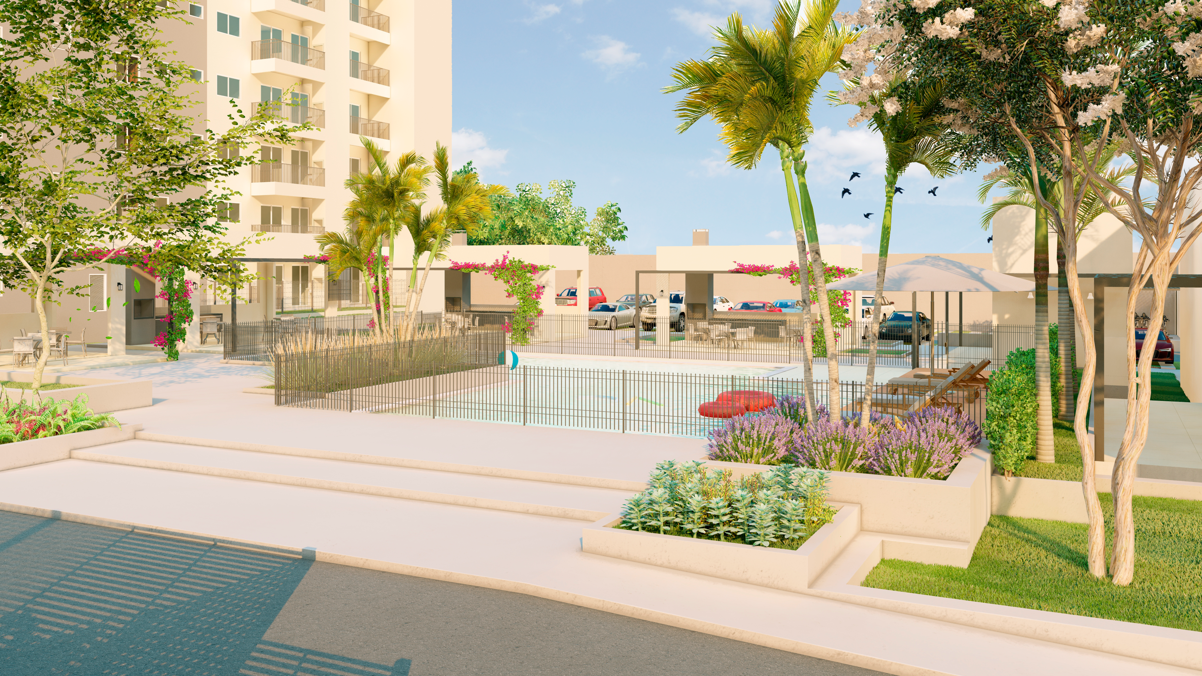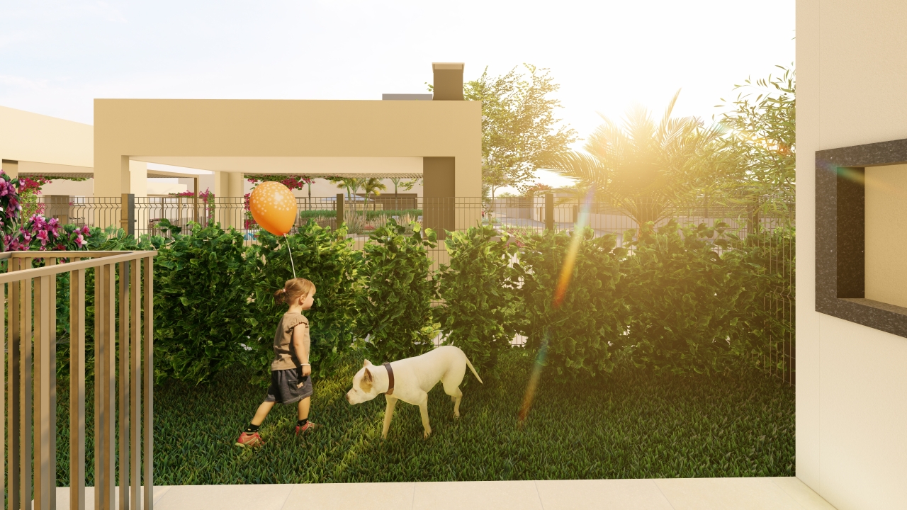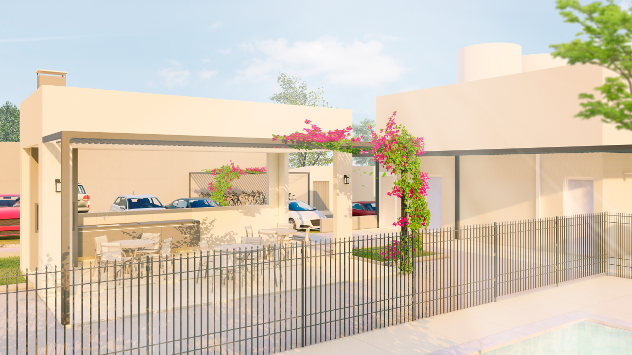 Os espaços de uso comum são um salão de festas (capacidade 180 pessoas), 4 quiosques com churrasqueira, um vestiário, uma piscina, um deck solarium, uma quadra poliesportiva (medidas oficiais), um bicicletário, um playground, uma meia quadra de basquete, uma central de GLP, um depósito de lixo, 10 vagas de estacionamento para visitantes, 1 vaga de estacionamento por apartamento.