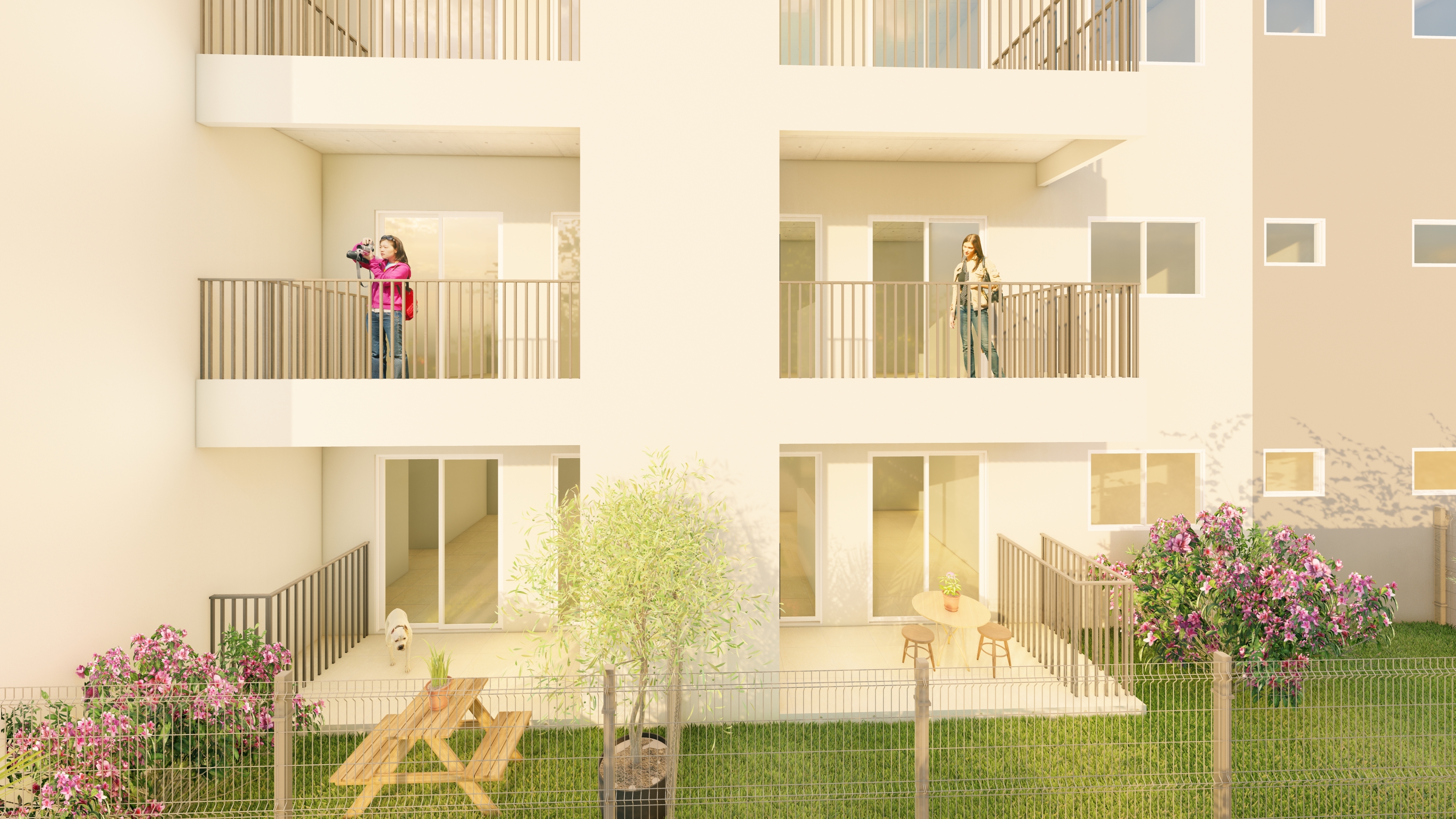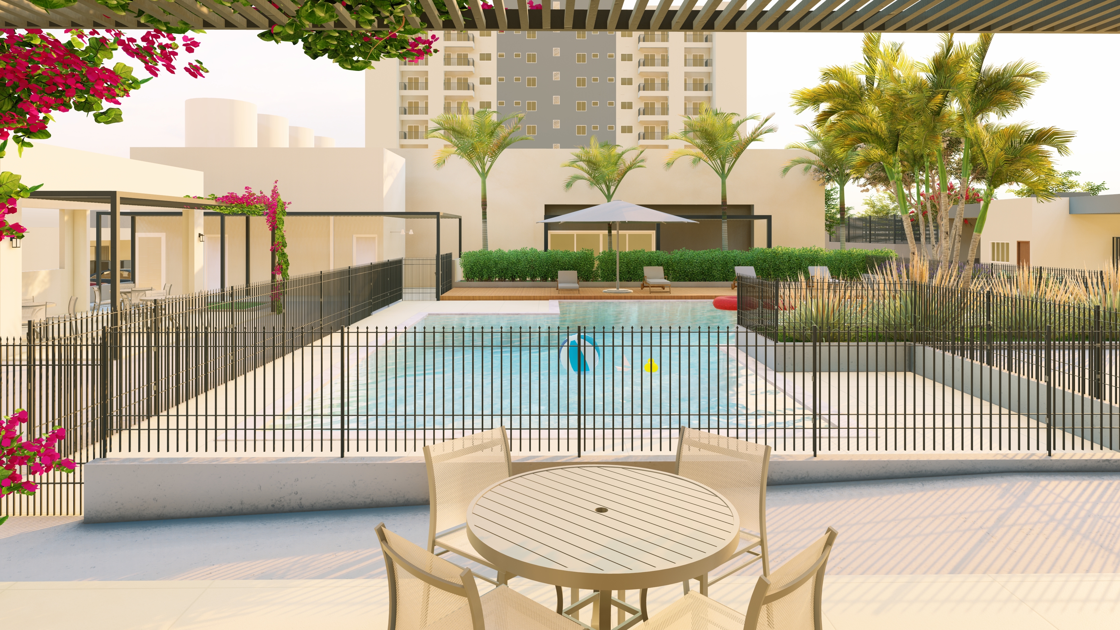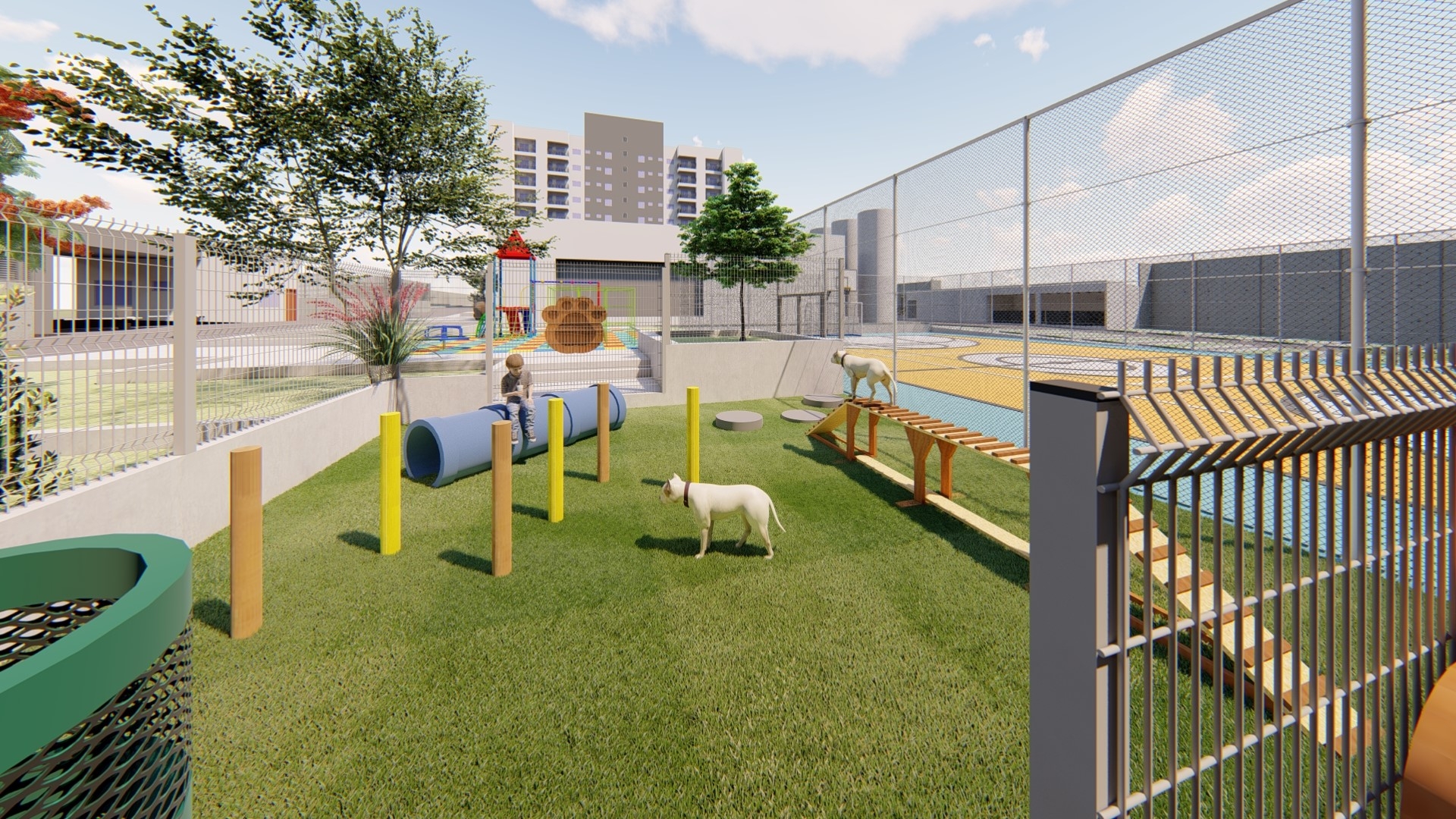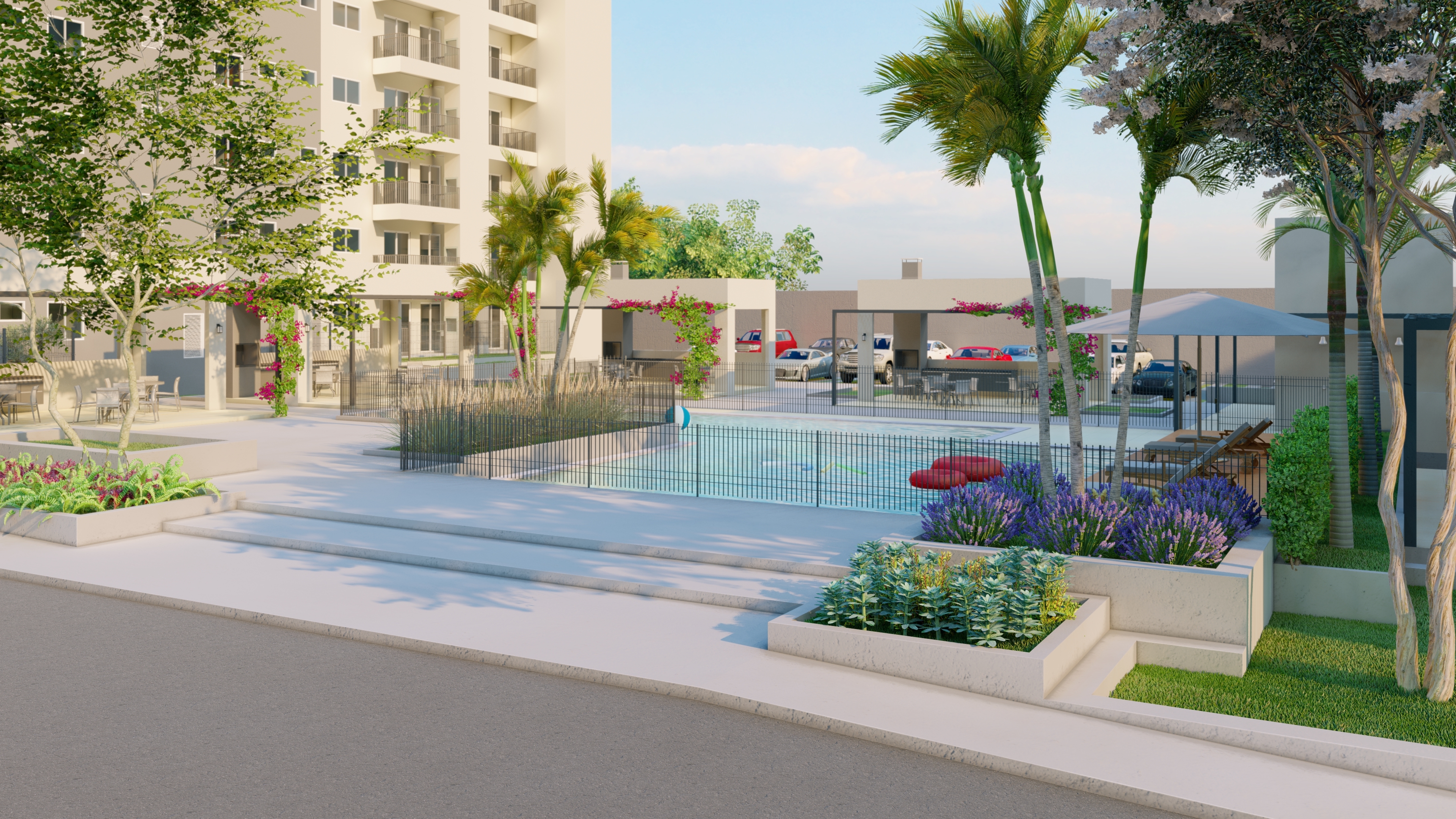 Os espaços de uso comum são um salão de festas (capacidade 180 pessoas), 4 quiosques com churrasqueira, um vestiário, uma piscina, um deck solarium, uma quadra poliesportiva (medidas oficiais), um bicicletário, um playground, uma meia quadra de basquete, uma central de GLP, um depósito de lixo, 10 vagas de estacionamento para visitantes, 1 vaga de estacionamento por apartamento.